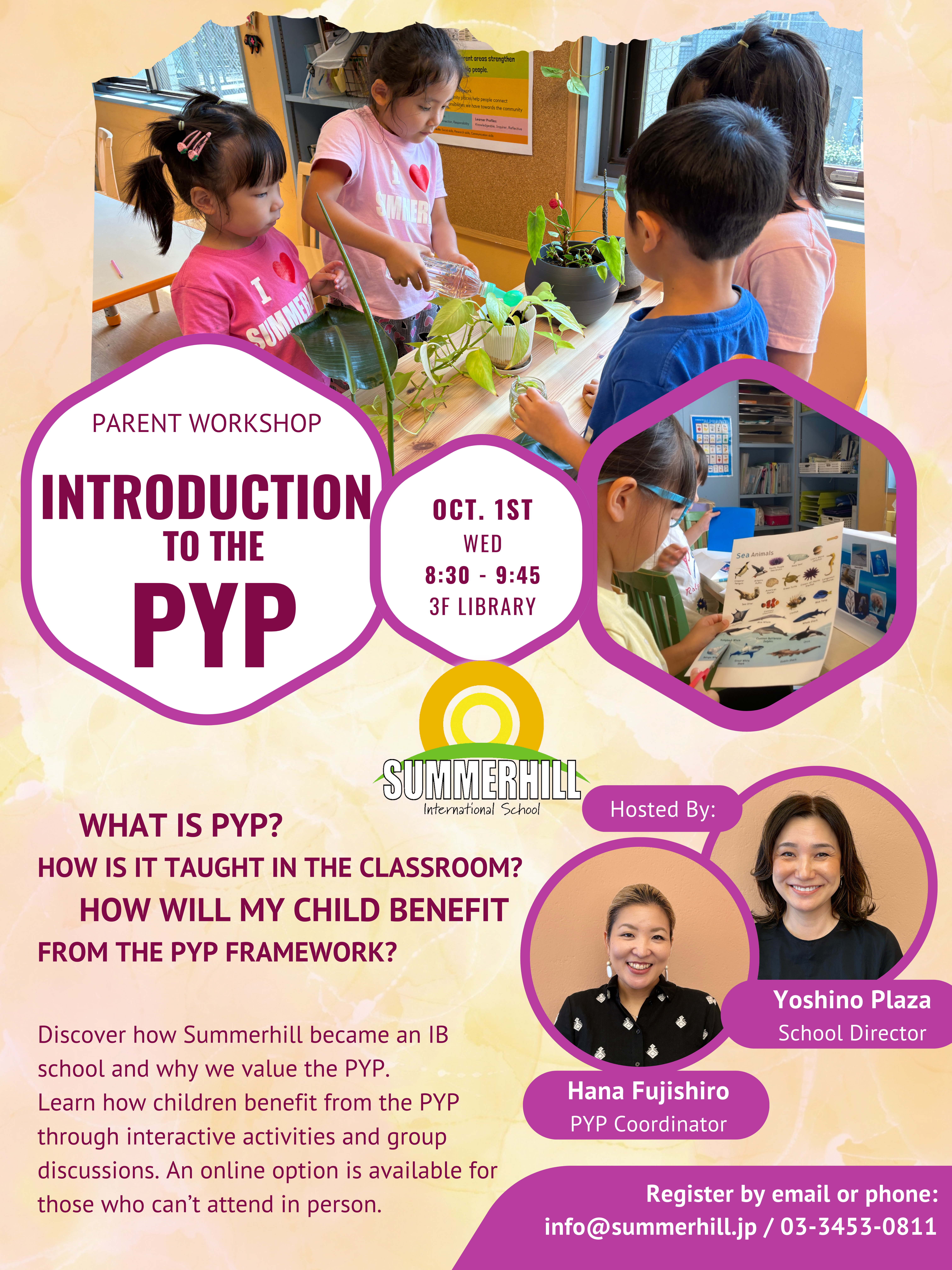 We are happy to invite you to our upcoming Parent Workshop, hosted by Yoshino Plaza (Director), and Hana Fujishiro (PYP Coordinator & Librarian). This session will help you gain a deeper understanding of the IB Primary Years Programme (PYP) and how it comes to life in our classrooms.